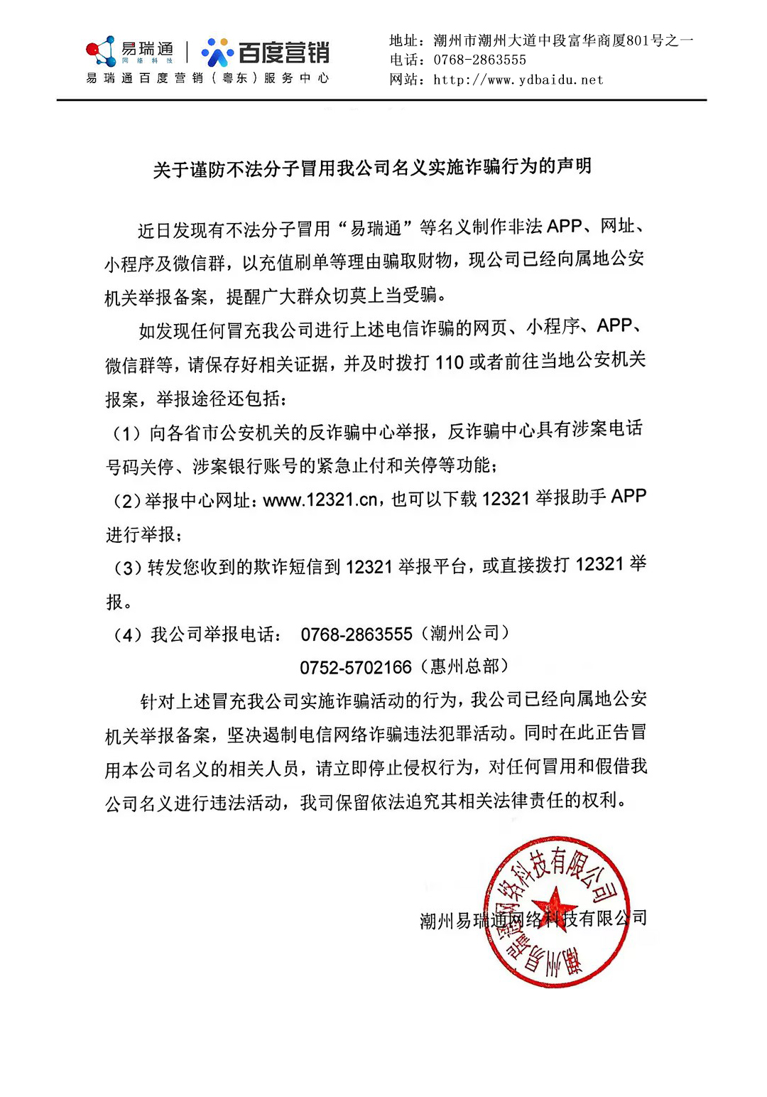 近期,我司發(fā)現(xiàn)社會上有不法個體、人員盜用我司品牌或公司名稱進行誤導(dǎo)性宣傳、開發(fā)市場并進行非正當業(yè)務(wù)往來,該類行為皆屬其個人(或團隊)行為,不代表本公司,本公司不承擔任何法律責任。并且該行為已經(jīng)嚴重誤導(dǎo)了消費者及我司客戶,嚴重損壞我司利益及聲譽。為避免造成廣大社會朋友的損失,惠州總部、汕頭分部、潮州分部三家公司發(fā)出以下公告: